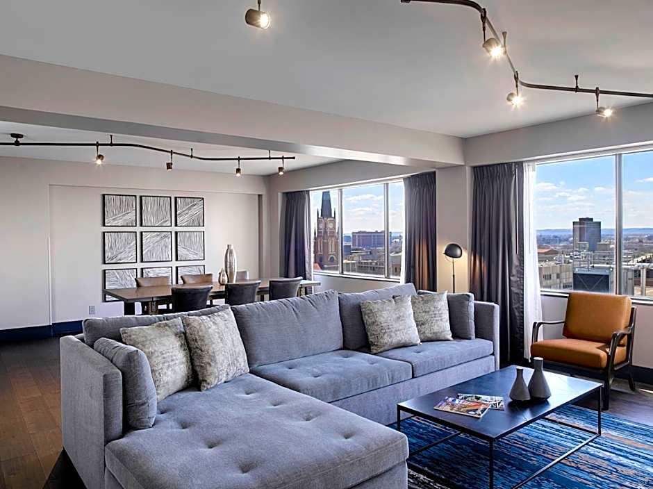This suite has a conference table for 8 guests and a kitchen with a full size refrigerator. It includes luxury bedding and top notch in-room entertainment with a flat-screen HDTV. WiFi access is included as well.